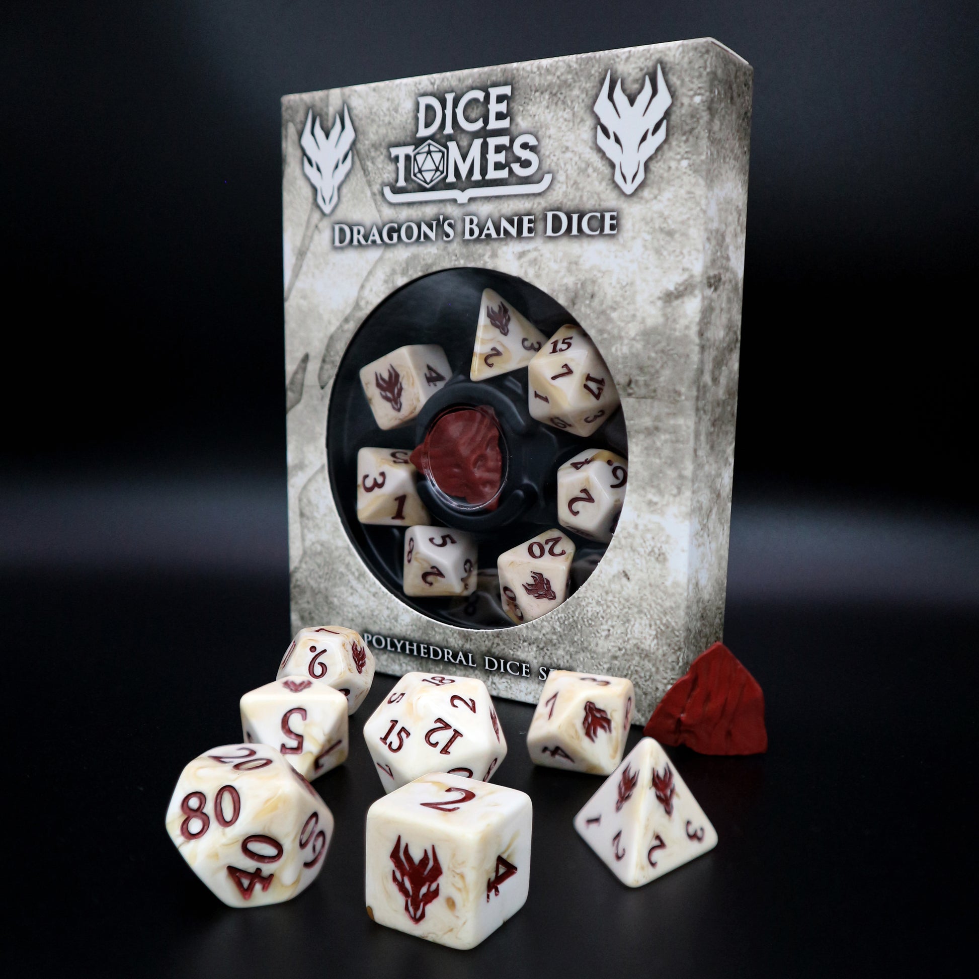 Crafted from dragon bone and inked with its blood, the Dragon's Bane dice are a trophy for only the truly worthy, and a lasting reminder of an epic victory over the mightiest of creatures. Each set contains: