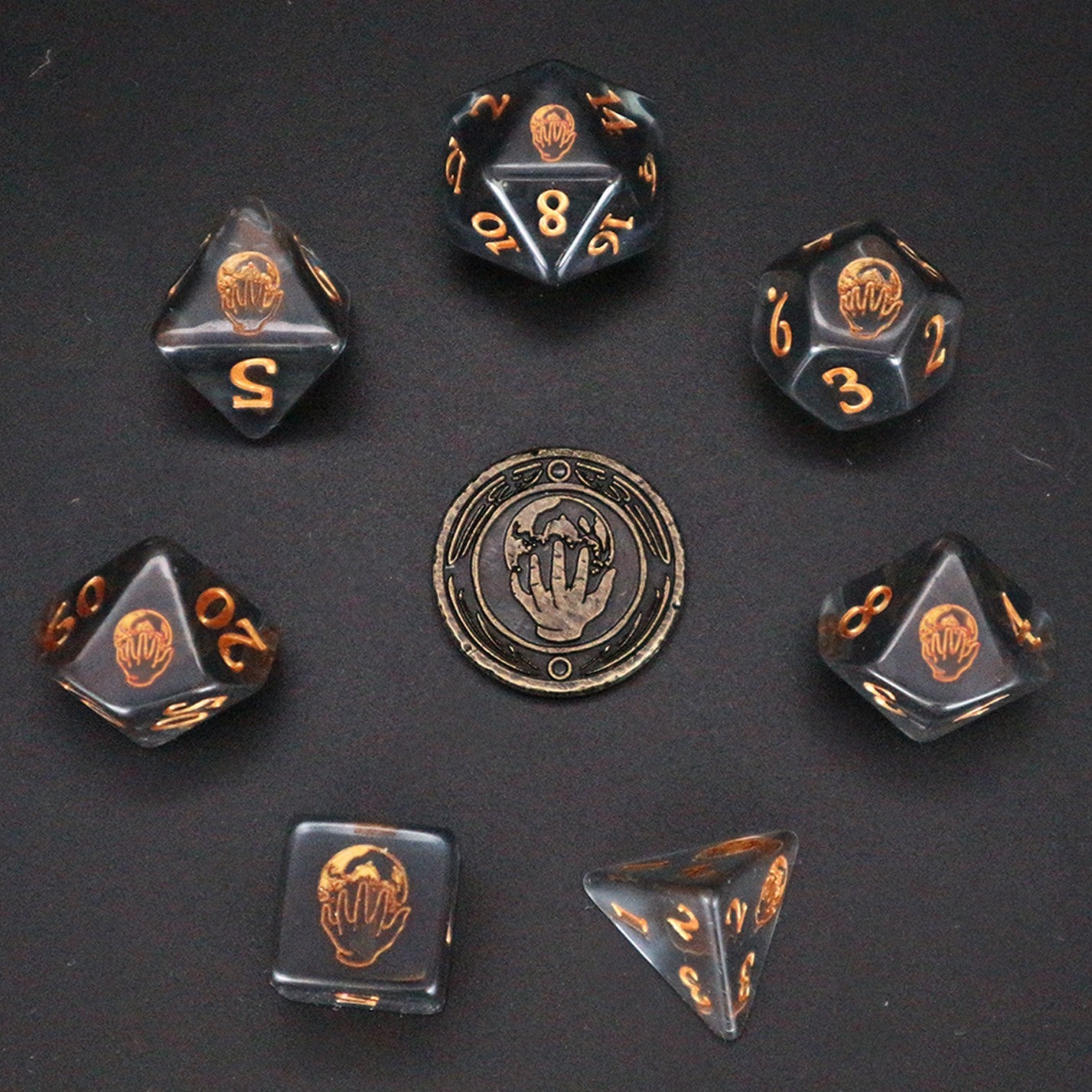 Featuring the symbol of the Creation, this premium polyhedral dice set is perfect for weavers of realities and masters of worlds.