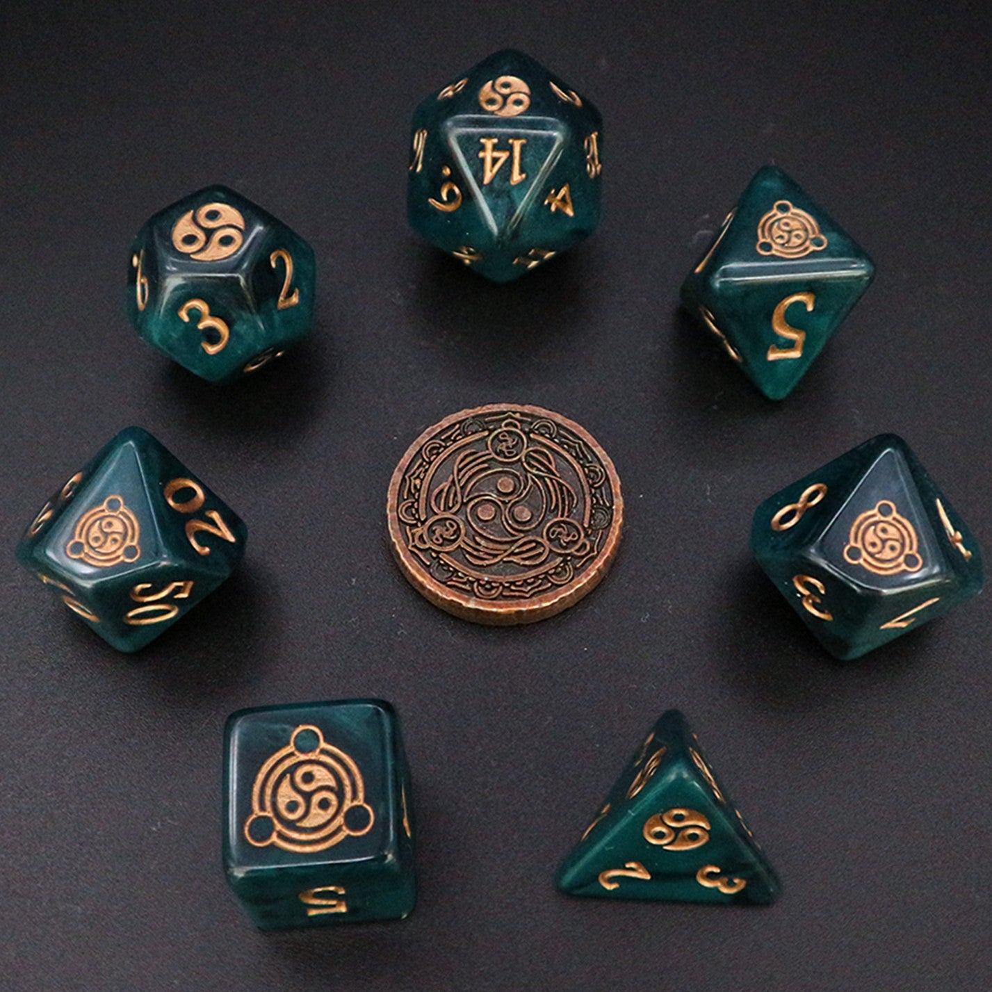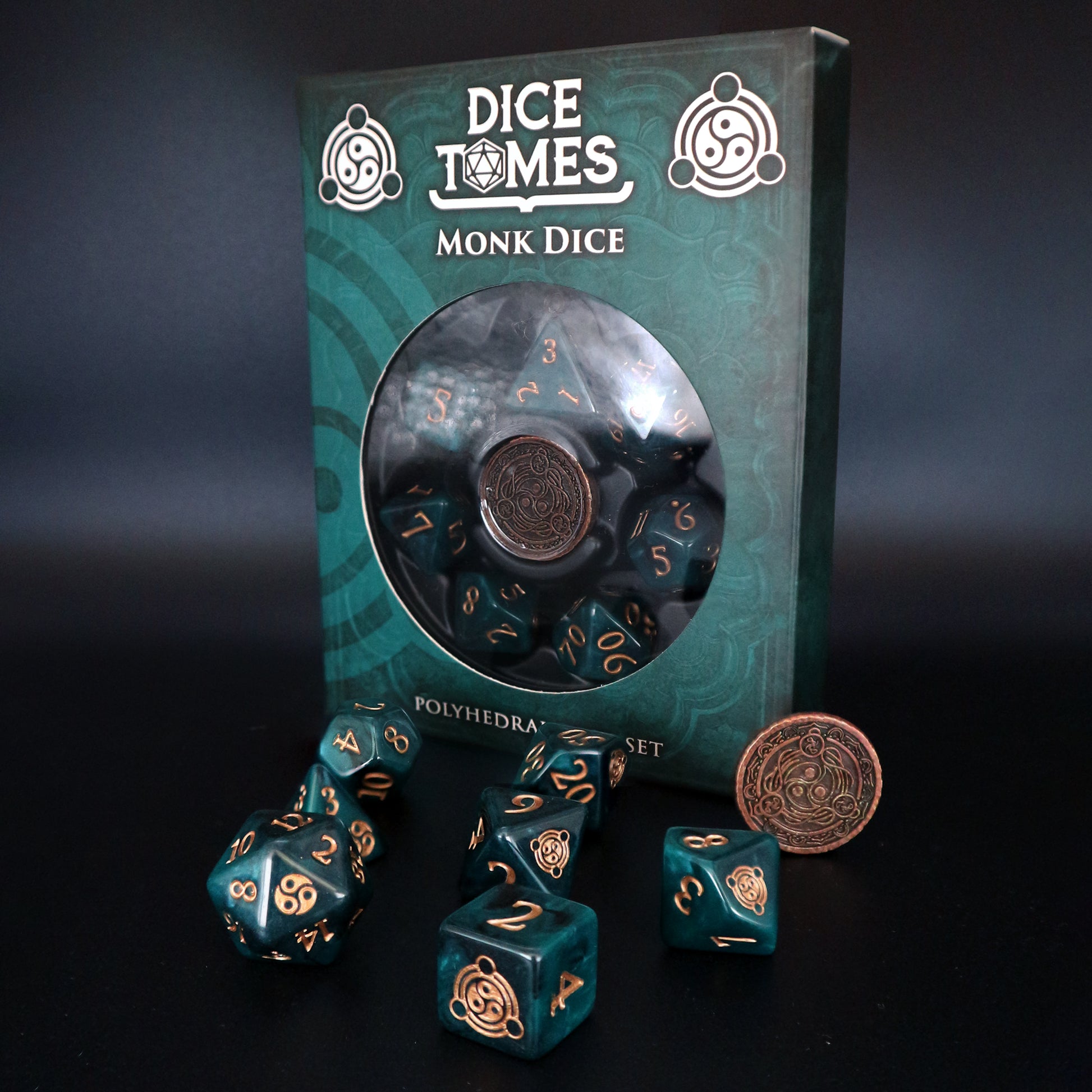 Featuring the symbol of Balance, this premium polyhedral dice set is perfect for Monks, Disciples and Votaries who seek perfection and balance in all things. Each set contains:
