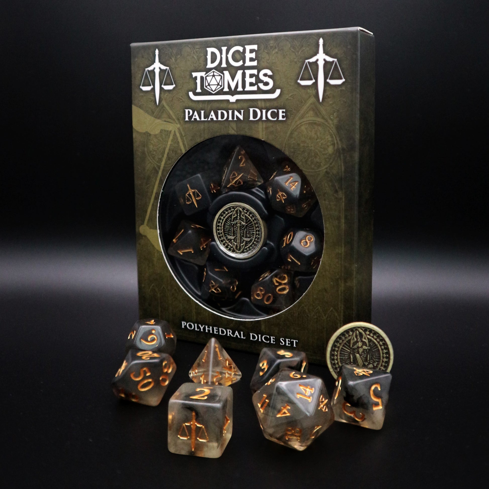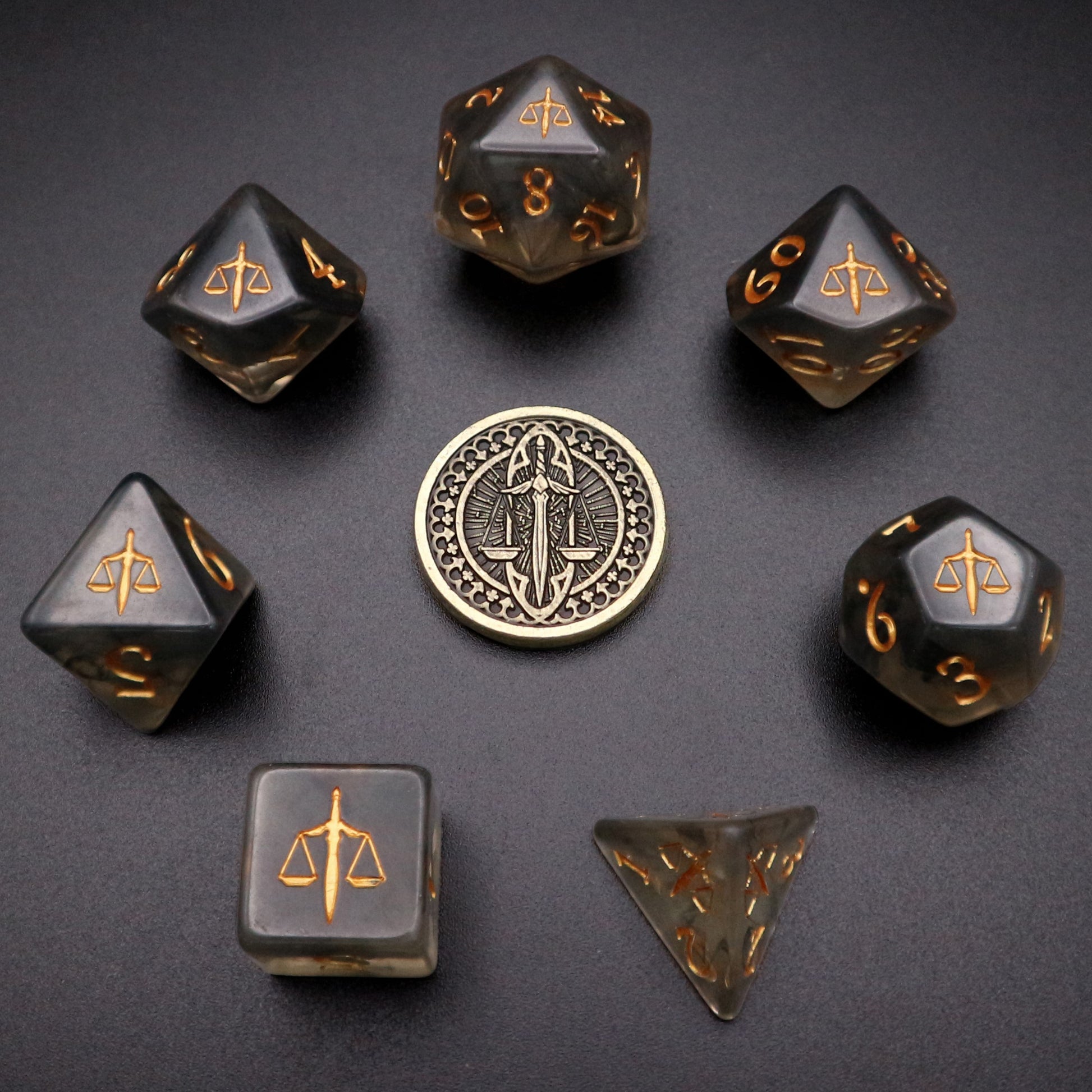 Featuring the symbol of the Righteous, this premium polyhedral dice set is perfect for paladins, champions and guardians of the sacred whose volition is absolute. Each set contains: